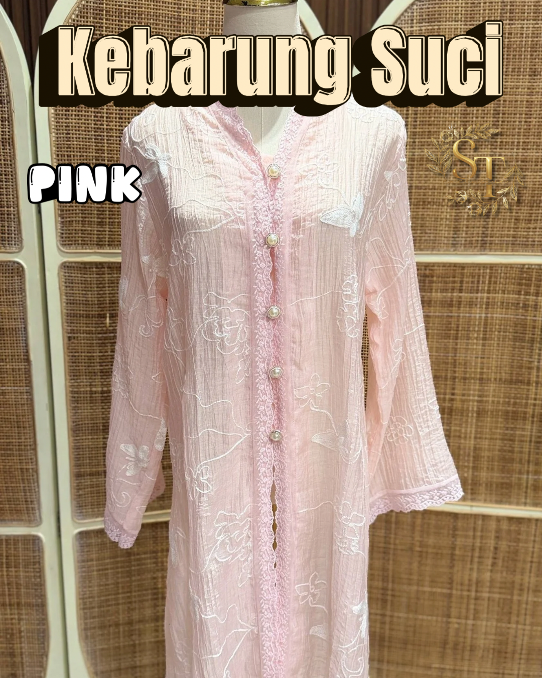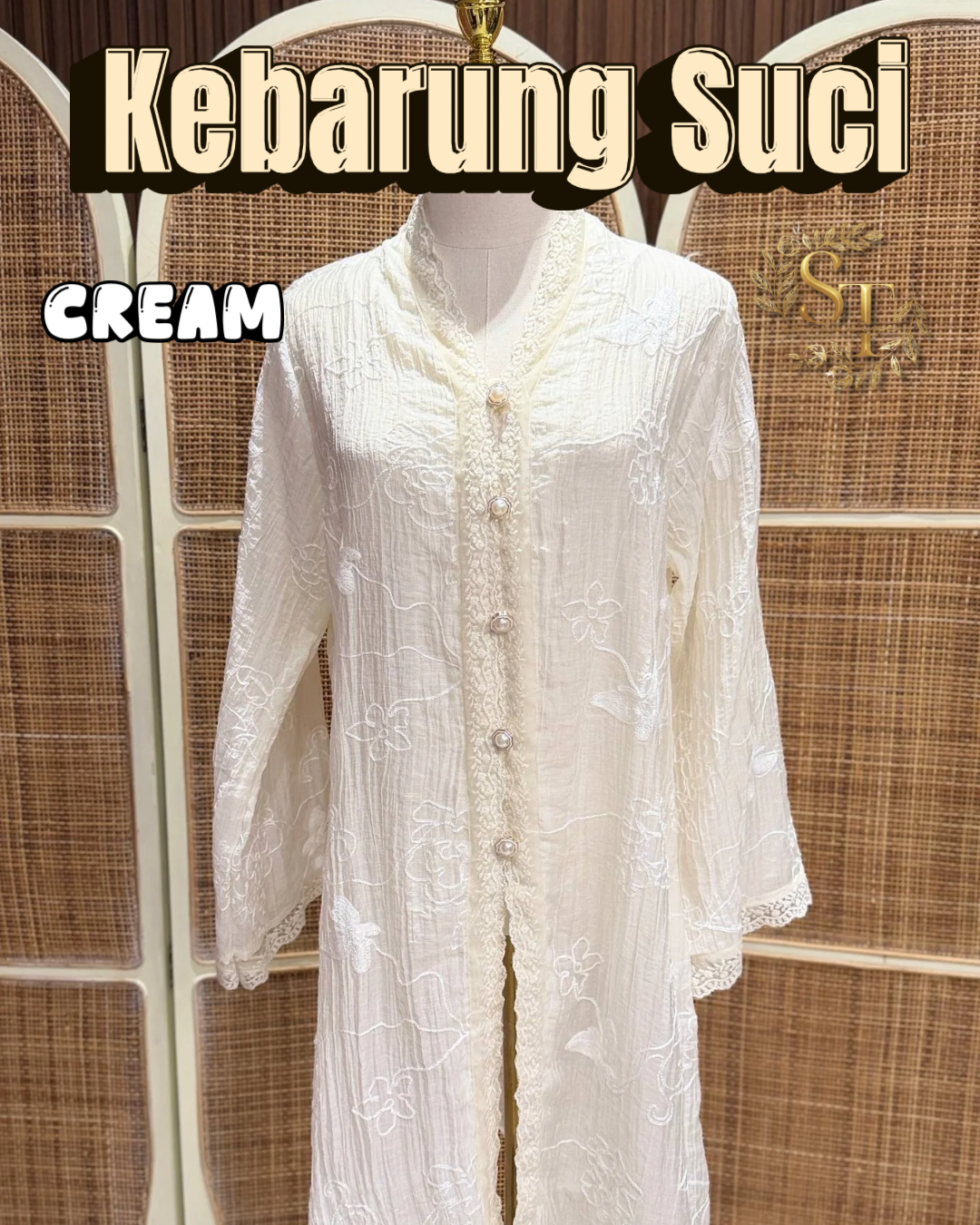 Kebarung Suci The Kebarung Suci is crafted from lightweight and airy material, offering a comfortable and elegant drape for all-day wear. This freesize piece fits up to 55 cm pit-to-pit (PTP) and features a middle front slit for ease of movement and added style.
